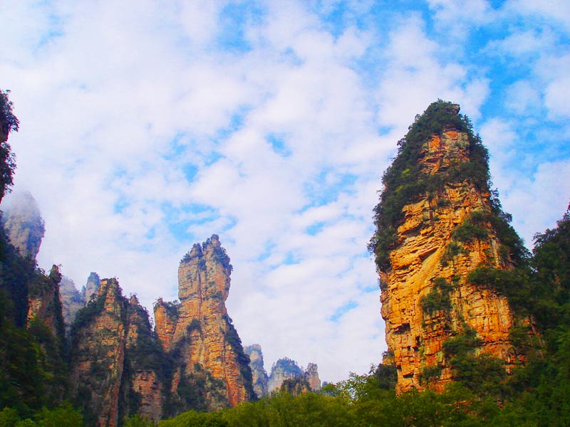 天門山國家森林公園四面絕壁,雄偉壯麗。保存著完整的原始次生林,植物資源豐富,有世界罕見的高山珙桐群落。天門山文化底蘊深厚,留有大量贊詠天門山的詩詞,更有眾多神聞傳說,被譽為“張家界之魂”。山頂天門山寺自唐朝建成以來香火鼎盛,寺外有七級浮屠,掩映于青枝綠葉中,古雅幽清。善男信女入寺拜佛,撞鐘響徹天際,擊鼓震動山岳,香煙裊裊如云。明萬歷年間南岳僧在此傳經授戒,從此聞名遐邇,朝山拜佛者達周邊四郡十余縣,信士遍及湘西北,天門山因此成為 “湘西第一神山”。天門山終年云霧繚繞,云海景象變化無窮。山間溶丘、石芽廣布,奇石秀木及珍禽異獸繁多,更有飛瀑流泉噴涌而出。天門山兼峰、石、泉、溪、云、林于一體,集雄、奇、秀、險、幽于一身,被譽為空中原始花園。天門洞、天縫渡仙、五指山、將軍石等是有名的峰林景觀,還有神秘的千佛洞等待你的探奇;山間的韓家溝則是富蘊滿族風情的村落——這里久居的幾十戶滿族農家至今仍完好保留著其在語言、飲食、衣著、居住以及婚慶殯葬等方面的滿族風俗,是難得的民俗文化旅游地。