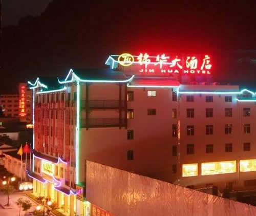 武陵源錦華大酒店是一家按國(guó)家四星級(jí)標(biāo)準(zhǔn)、2009年5月新修建成的豪華旅游度假酒店,地理位置優(yōu)越,位于武陵源汽車(chē)站旁.酒店集觀(guān)光旅游、度假、商務(wù)會(huì)議、品嘗土家美食等多功能為一體,酒店建筑融合張家界地區(qū)的民族風(fēng)情和建筑文化,是張家界地區(qū)最有土家風(fēng)情的星級(jí)酒店之一。 武陵源錦華大酒店安裝了數(shù)控中央空調(diào)系統(tǒng)、空氣源熱水系統(tǒng)。24小時(shí)供應(yīng)冷熱水。 武陵源錦華大酒店擁有客房100間,其中套房3間、標(biāo)準(zhǔn)間96間、單人間1間,客房?jī)?nèi)配有液晶電視、閉路電視和寬帶接口;餐要包廂8個(gè)、豪華包相一個(gè)、極具當(dāng)?shù)靥厣摹盎鹂游荨卑鼛?個(gè)、中餐宴會(huì)廳可同時(shí)容納300人就餐。酒店還配備一個(gè)高標(biāo)準(zhǔn)多功能的現(xiàn)代化會(huì)議室,安裝有電視電話(huà)會(huì)議系統(tǒng),可以舉行各種類(lèi)型的中小型會(huì)議。