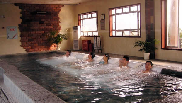 最大的主溫泉池叫“同心泉”,形似一顆紅心,寓意同心同德,萬眾一心,眾志成誠。同心泉可供200人同時共浴,水溫38-41度,可躺可坐,沐浴其中,仰望藍天白云,遠眺雄山奇峰,伴隨著典雅的鄉(xiāng)村音樂,周身便覺溫曖如春、愜意萬分。