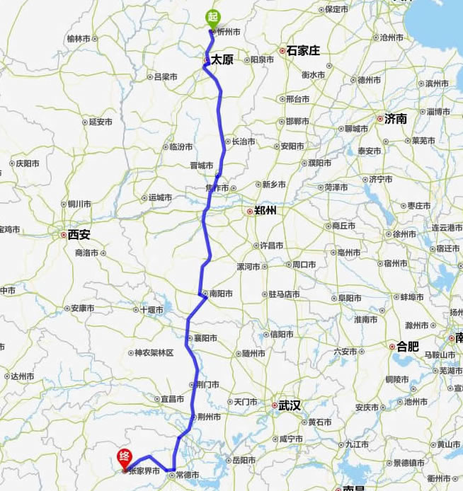 左右,沿途經過忻州——太原——長治——焦作——南陽——襄陽——荊門——荊州——常德(也可以走國道經澧縣、石門縣)——慈利——張家界。