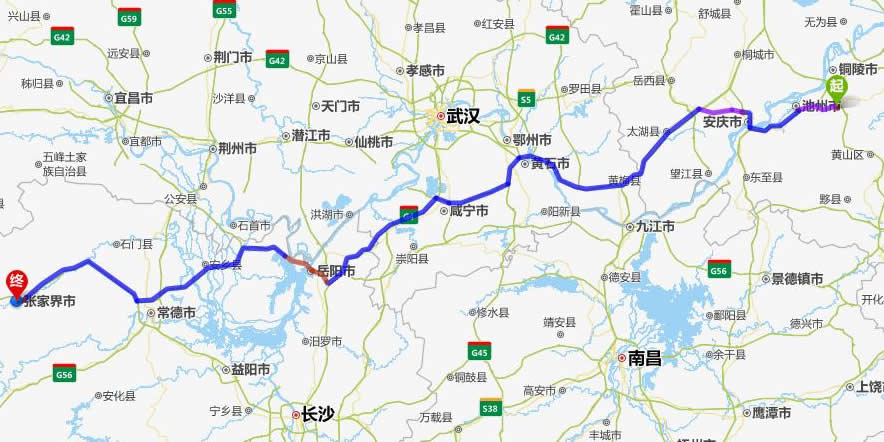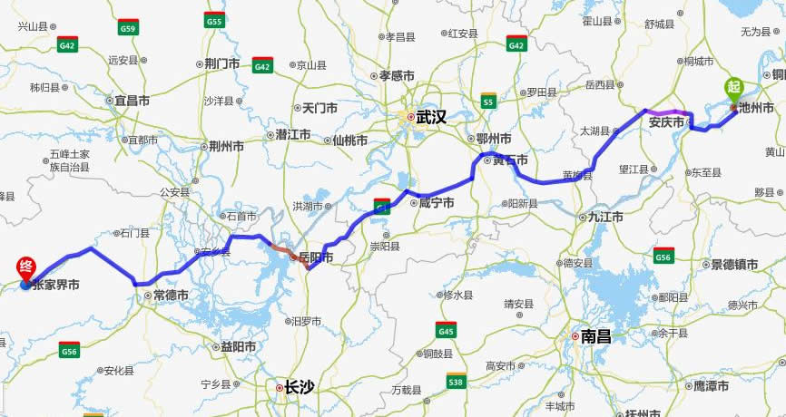 左右,沿途經過青陽縣——池州市——安慶市——太湖縣——黃梅縣——黃石市——咸寧市——赤壁市——臨相市——岳陽市——安鄉(xiāng)縣——常德市——慈利縣——張家界。